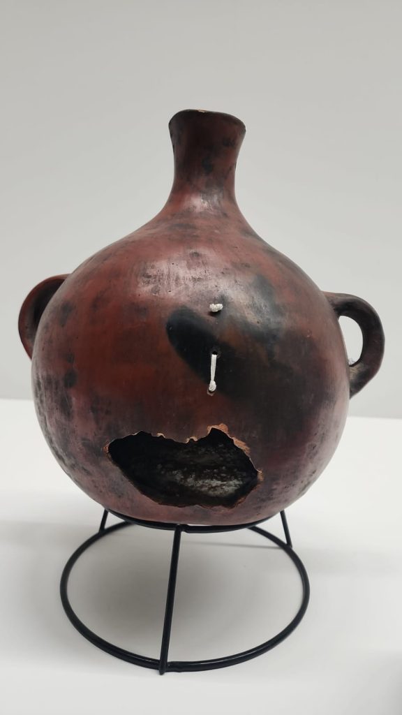 Ellos encontraron varias piezas con un solo agujero o con remiendos. La teoría es que se les hacía un agujero porque cuando la persona moría, también el objeto moría. Al hacerle un pequeño agujero a las cerámicas no se podían utilizar más y perdían su función. También lo hacían para que los museos no las tomaran o se las llevaran para exhibirlas. Era una destrucción intencional. Decidí hacerles pequeños agujeros a mis cerámicas nada más para coserlas, como abrazarlas, como un remiendo, como una reparación. Adentro tienen luz.
